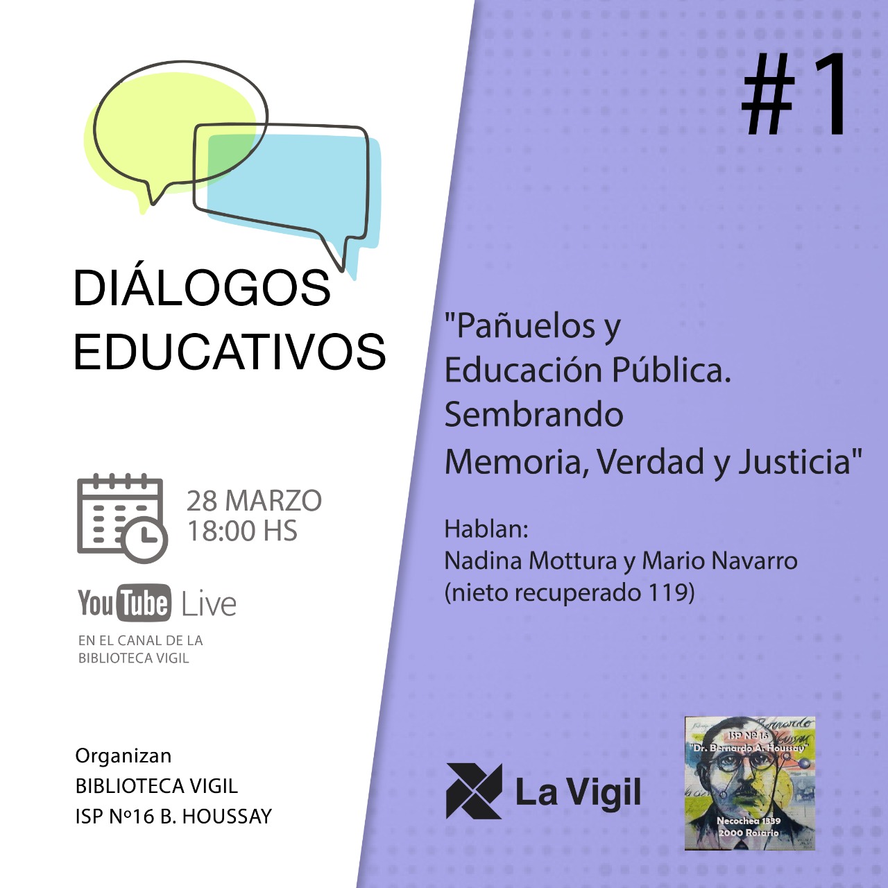 ▬ 28/3, 18 h, Nadina Mottura y Mario Navarro (nieto recuperado 119): «Pañuelos y Educación Pública. Sembrando Memoria, Verdad y Justicia»