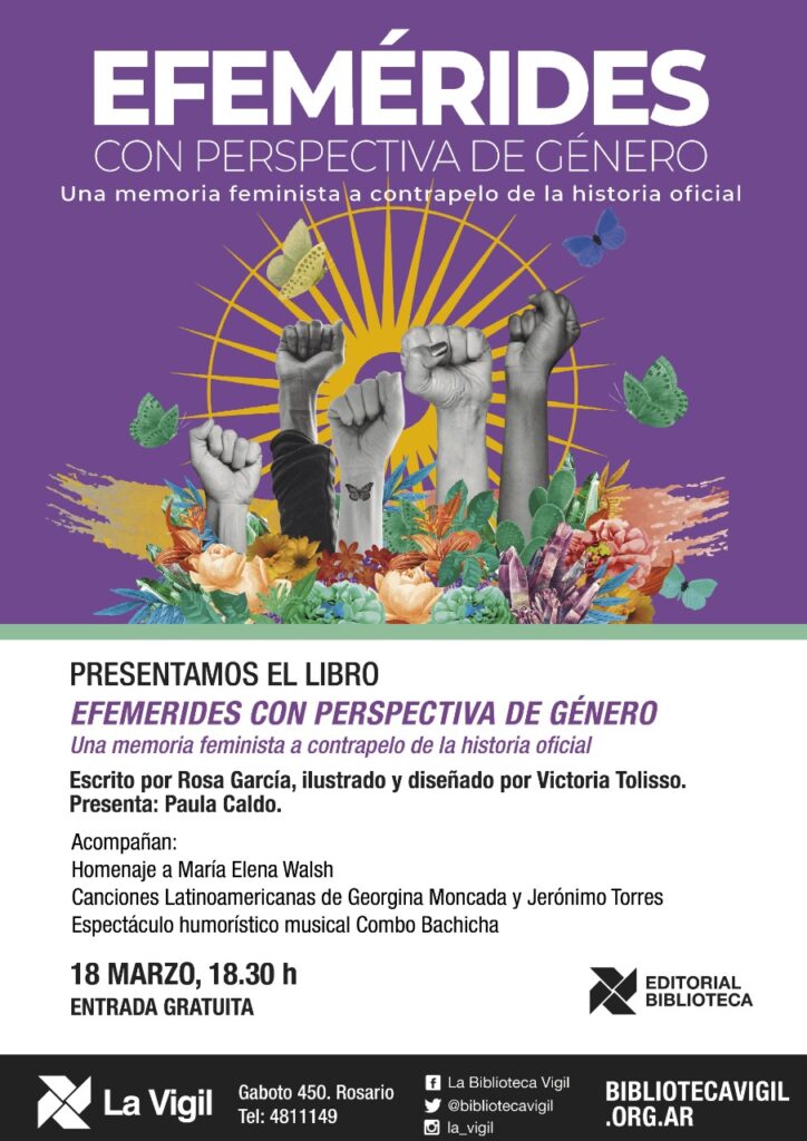 ► «Efemérides con perspectiva de género. Una memoria feminista a contrapelo de la historia oficial», escrito por Rosa García, ilustrado y diseñado por Victoria Tolisso.