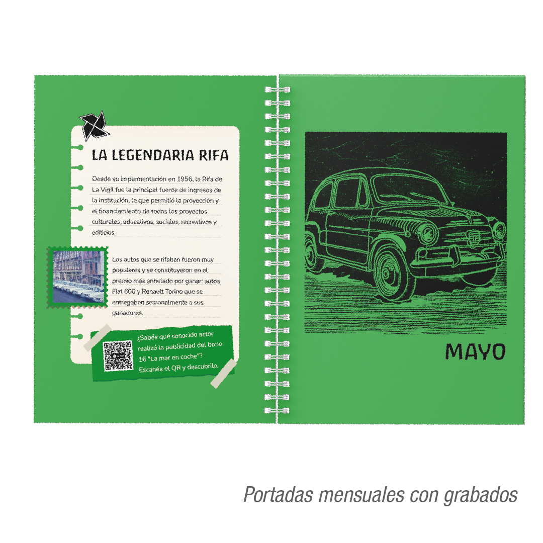 Incluye 12 portadas mensuales exclusivas, con grabados realizados por el Laboratorio de las Artes sobre la historia de La Vigil, para hacer memoria juntxs. Además, encontrarás anécdotas, datos curiosos y efemérides, vinculando tus días con los momentos más significativos para nuestra comunidad.