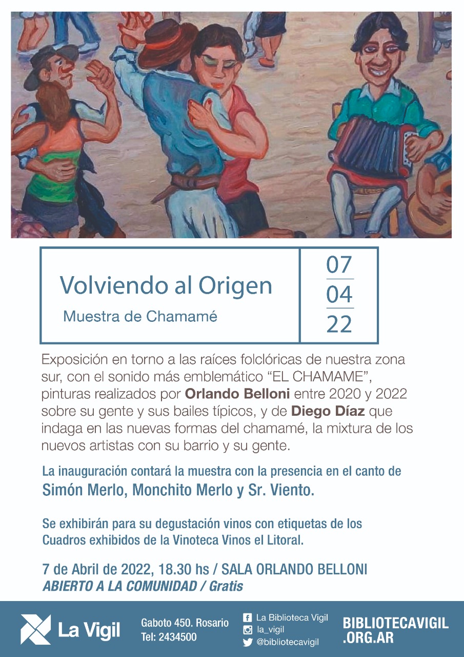 Exposición en torno a las raíces folclóricas de nuestra zona sur, con el sonido más emblemático “EL CHAMAME”, pinturas realizadas por Orlando Belloni entre 2020 y 2022 sobre su gente y sus bailes típicos, y de Diego Díaz que indaga en las nuevas formas del chamamé, la mixtura de los nuevos artistas con su barrio y su gente.